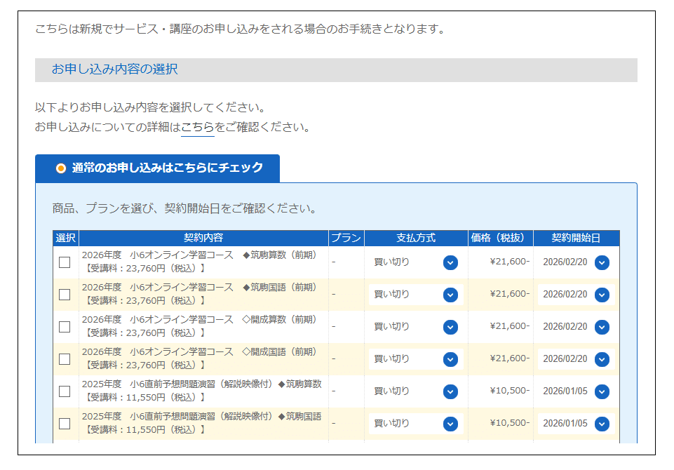 「通常のお申し込みはこちらにチェック」のラジオボタンをチェックし、申し込みたい商品を選択してください。