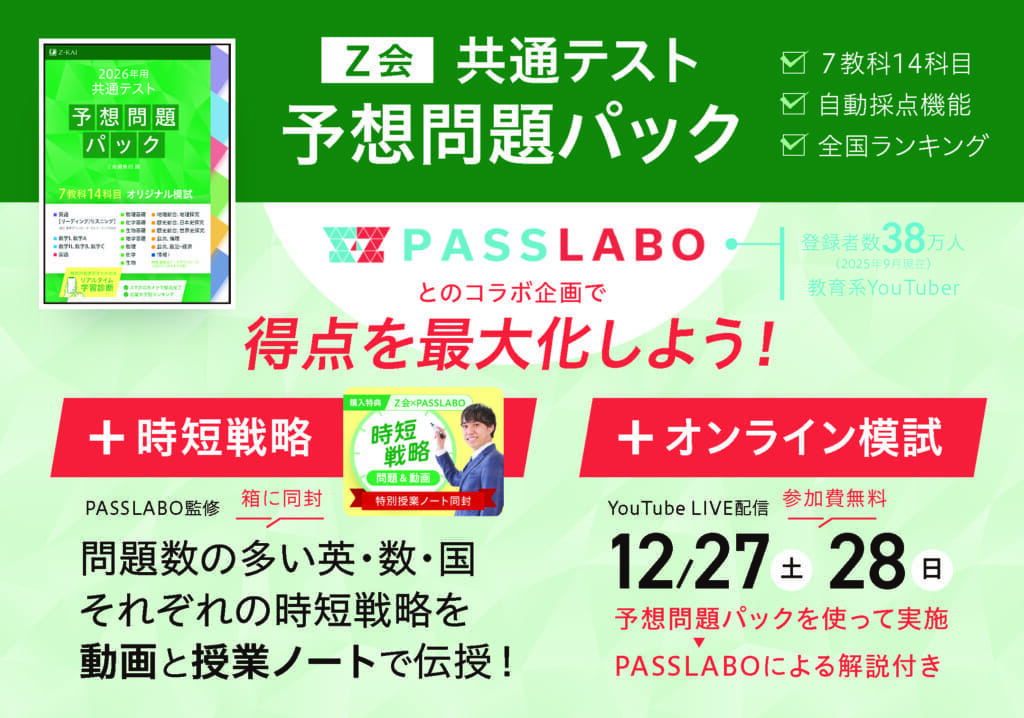 今回、Z会の実戦模試がリニューアルしたことを記念して、教育系YouTuber 「PASSLABO」さんとZ会編集部の対談が実現いたしました! 普段は聞けない編集部の裏側や、PASSLABOさんだからこそわかるリアル視点で共通テストについてお話いただいております。 共通テストを受ける受験生の方は、ぜひ参考してみてください。