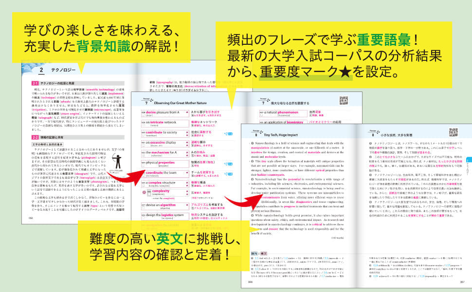英文、背景知識ともに近年の入試問題の出題傾向を踏まえたテーマを厳選し、全面的に刷新しました。好奇心を刺激する英文や解説を読み、学びの楽しさを味わうことができます。