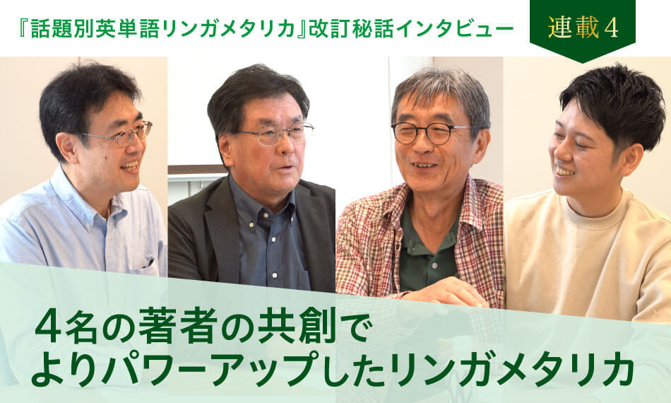 木村先生 どんなテーマをどこまで解説するかとか、そこで覚えるべき英語についてどこまで含めるかを、4名が対等な関係で、言いたいことを言い合って進めていけたのが良かったと思いますね。 一人で4人分頑張っても、こういうふうにはきっとならなかったと思います。