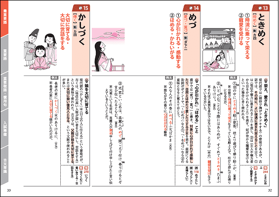 学校の先生方へのアンケート・大学入試の出題分析結果などを総合して、入試に必要十分な345語を厳選しました。すべての意味に例文がついているので、単語の意味を確認し、例文を読みながら、文脈に応じた単語の意味を確認できます。この1冊で、入試に必要な古文単語が身につきます。