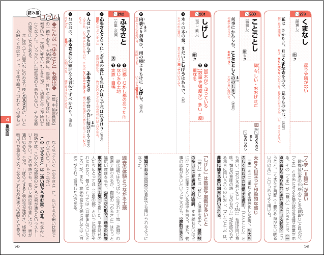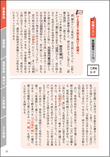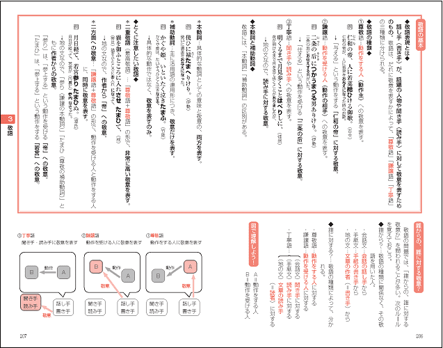毎見開きに設けた「コラム」コーナーでは、古文常識や敬語の用法を学べます。また、「敬語章」を設け、敬語について集中的に学習できるようにしています。