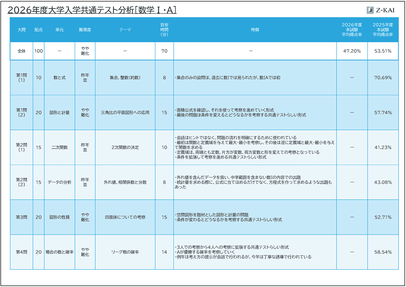 - 難易度調整のためか、図形問題を中心に誘導が丁寧な傾向は2025年度と同様であった。文章量が多い大問・中問が増えたため、読み取りに時間がかかってしまった受験生が多かったと思われる。