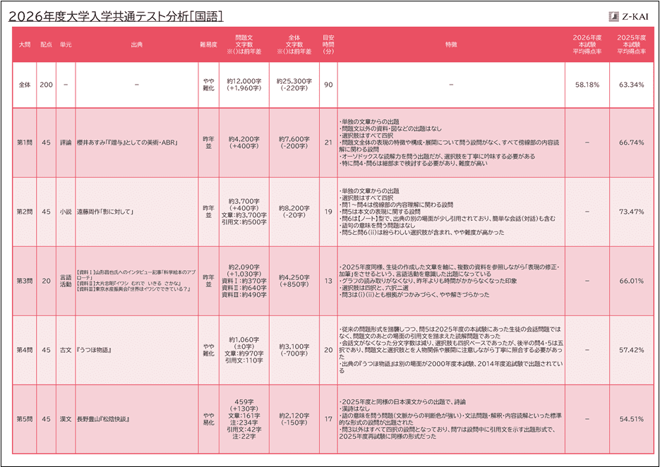 - 第1問は2025年度より抽象度の高い単独文章、第2問はノート+会話形式の設問を含む単独文章、第3問は複数資料の2025年度に比べ文字量が増えたが、共通テストとしては標準的な難易度であった。また、第4問(古文)はやや難しく、第5問(漢文)は易しかったので、全体的には標準的なレベルであった。