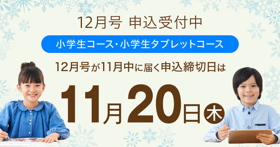 小学生向けコース入会をご検討の方へ 12月号のご案内 Z会小学生向けコースでは、現在12月号からのご受講を受付中です。 各学年の内容についてくわしくは以下をご覧ください。 ※難関国私立中学をめざす方は、「中学受験コース」のページをご覧ください。 ※12月号の最終申込締切日は11/28(金)です。 学年をお選びください。 中学受験コースはこちら 1年生 12月号 2年生 12月号 3年生 12月号 4年生 12月号 5年生 12月号 6年生 12月号