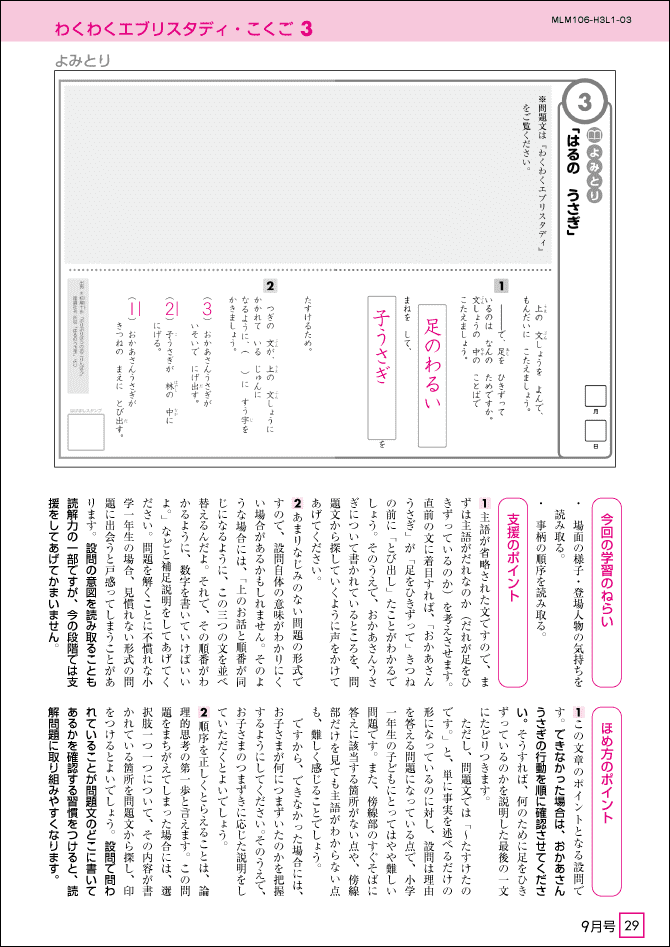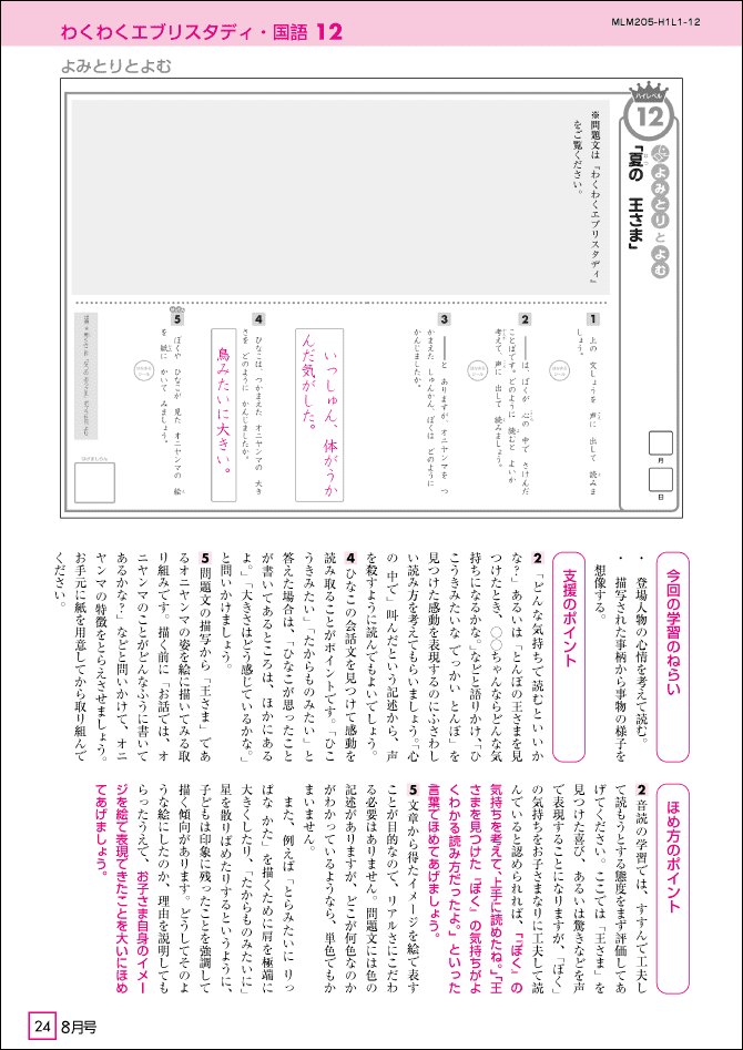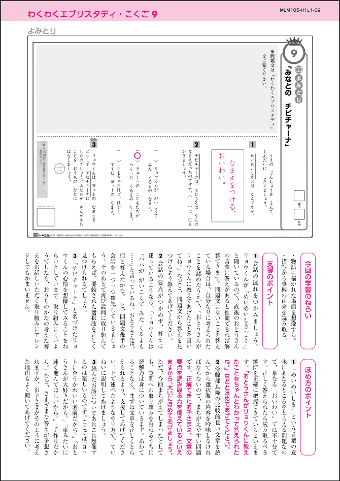 声や絵による表現は、決まったひとつの正答がなく、特に評価の難しい問題です。そのため、解説では支援のしかたやほめ方を重点的に紹介しています。学習のねらいにそって登場人物の心情を理解し、声や言葉で表現しようとする工夫が見られたら、それがたとえ拙いものであっても十分にほめていただきたいと思います。