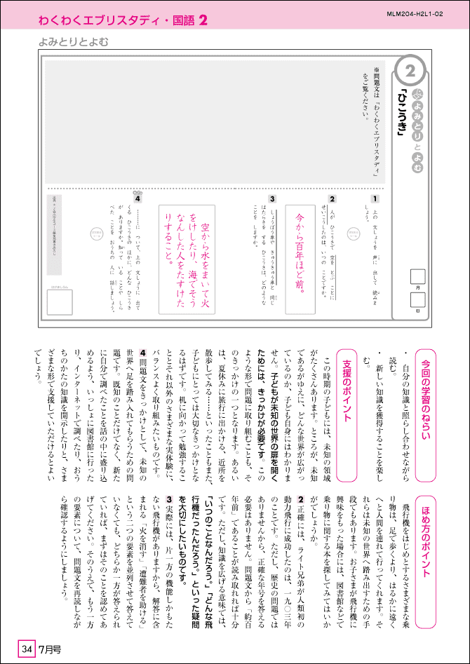 「支援のポイント」では、問題に取り組む際にどのようにアドバイスすればよいのかを紹介しています。また、「ほめ方のポイント」には、丸つけの際に特にほめていただきたい点を掲載。単に正解だったことだけではなく、「ここが理解できている」「こんな力がある」と具体的にほめてあげることが、お子さまの自信につながります。