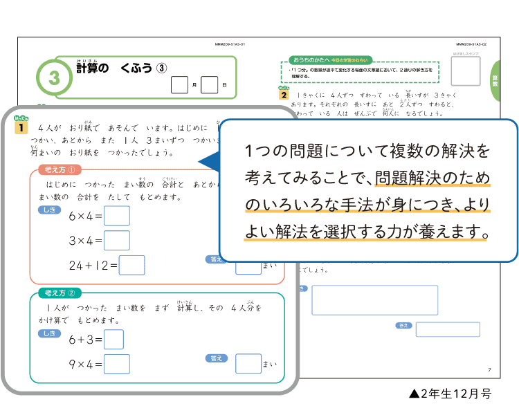 多様な問題形式に出合うことで、問題の着眼点や、複数の解き方を学びます。はじめは解き方がわからなくても、だんだんと問いの要所を見抜き、用いるべき解法が選択できるようになります。