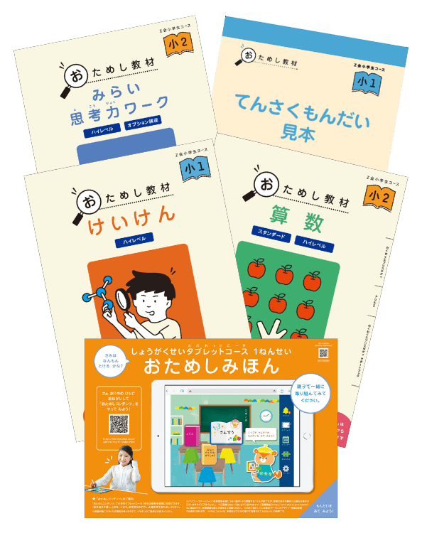 ●小学生コースおためし教材:国語/算数、けいけん、みらい思考力ワーク、添削見本