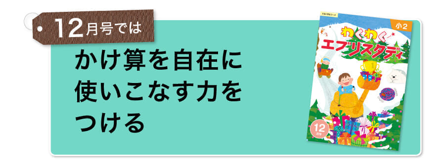 12月号では、算数は「かけ算・九九」の集大成として応用問題に挑戦。3年生につながる応用力を養います。