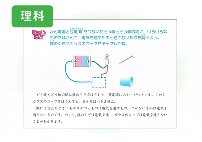 豆電球のあかりをつける実験を通して、回路が成り立つ条件や、電気を通すものと通さないものについて学習します。4~6年の「電気」に関する単元の土台となる、とても大切な単元です。さまざまな実験の方法と結果・解説や、豆電球やソケットの作りについての説明、練習問題などを通して、理解を深めることができます。