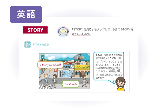 外国人の友だちに自分の町を案内する場面を題材に、「これは何?」「あれはきみたちの学校なの?」と質問したり、「それは図書館です。」と答えたりする表現を学習します。また、thisとthatの使い分けを、「これ」「あれ」と意味から覚えるのではなく、会話の流れの中で自然に身につけていきます。