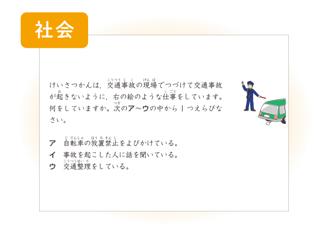 「地域の安全を守る働き」のうち、安全を守る仕事について、交通事故を防ぐためのしくみ、警察の仕事、暮らしの安全を守るためのしくみなどについて学びます。社会では各種資料を読み取る力が求められます。3年生ではイラストを用いた問題を積極的に出題し、読み取る力の向上を図ります。