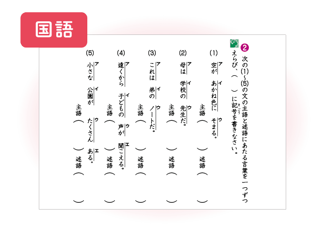 「主語」と「述語」について学習します。主語と述語は今後の文法学習の基盤になりますから、今の時期に確実に身につけておきたい内容です。設問では、文中の主語と述語を見つける練習をすることで、主語は文頭にあるとは限らないことや、まず述語を探し、それに対応する主語を探すという手順を確認します。