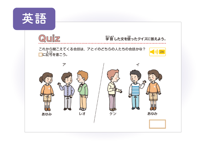 「トム、こちらはさおりだよ。」のように友人を紹介する表現を学びます。アルファベットのOo~Ttも学習し、表現とアルファベットの二本立ての学習により少しずつ英語に慣れていきます。また、リスニング形式の問題に取り組むことで必要な情報を聞き取る力を鍛えます。