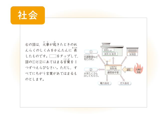 「地域の安全を守る働き」のうち、「火事をふせぐ仕事」について、火事発生時の対応、消防署の仕事、地域の消防の取り組みなどについて学びます。社会では各種資料を読み取る力が求められます。図も重要な資料の一つです。教材では図を用いた問題をさまざまなかたちで出題し、読み取る力の向上を図ります。
