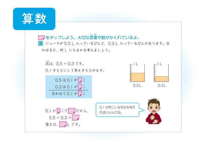 0.1をもとにした小数の表し方や、小数のたし算やひき算のやり方を理解します。4年生以降で習う小数のかけ算やわり算でつまずかないためにも、0.1を基準とする小数の見方を、3年生のうちに養っておくことが大切です。