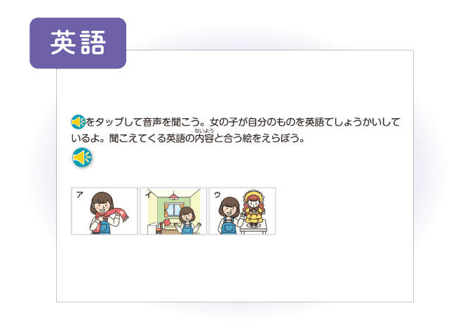 This is my ~. (これはわたしの~です。)などの表現を学習します。中学生や高校生向けの各種スピーキング・テストでは、イラスト説明問題がよく出題されます。This is my ~. はその形式の回答でベースになる重要な表現。名詞だけでなく、文で発話できるように、少しずつ練習していきます。