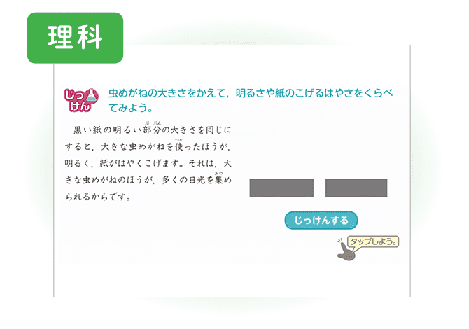 日光の性質や進み方、虫眼鏡での集め方について、さまざまな実験を通して学習します。実験の結果を予想したり、結果からわかることを考えたりする取り組みによって、条件を理解する力や論理的に考える力が身につきます。