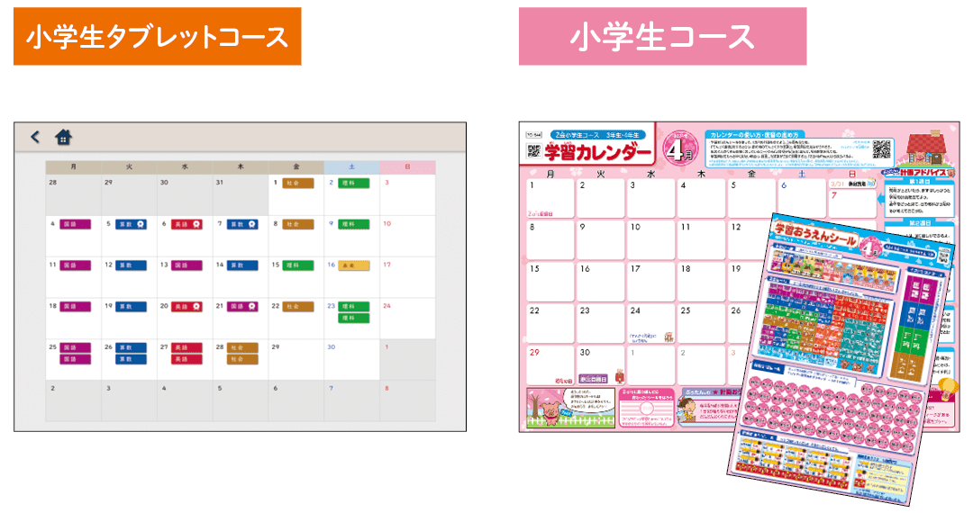 両コースとも、学習管理ツールとしてカレンダーをご用意しています。習いごとなどと両立しながら学習習慣が身につくよう、お子さまをサポートします。