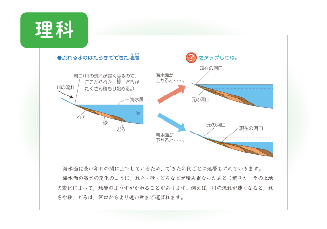 地層のでき方や変化について、流れる水や火山のはたらきと関連付けながら学習します。さまざまな実験や観察を通して学習するため、大地のつくりや変化というスケールが大きい事象に対しても、無理なく理解を深めることができます。練習問題では、地層の断面から各地層ができたときの環境や出来事について考察する問題などに取り組みます。
