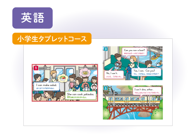 小学生タブレットコースでは、canや動作を表す表現を使って自分が「できること」や「できないこと」について伝えたり、Can you 〜?と相手ができることを尋ねたりする表現を学習します。canを使った表現は中学校以降も頻繁に登場するので、音声を聞き発音する中で、文の形を自然と身につけておくことが大切です。