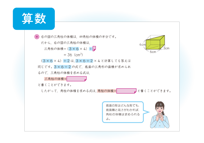 角柱と円柱の体積について学習します。体積を求めるためには、まず底面積を正確に計算する必要があり、三角形・四角形・円といったさまざまな図形の面積を求める公式を、しっかり身につけておくことがポイントです。教材では、底面の形が複雑な立体の体積についても考えることで、応用力を磨きます。