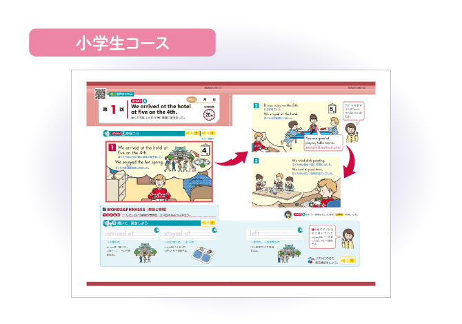 小学生コースでは、登場人物のボブが書いた日記の内容をもとに学習を進めます。音声やイラストにより内容理解の補助を行いますので、「まとまった量の英文」を読んだり書いたりするのが初めての方も心配はいりません。このような学習を通じて中学以降の「精読」や「少し長い文を書く」のベースを作ります。