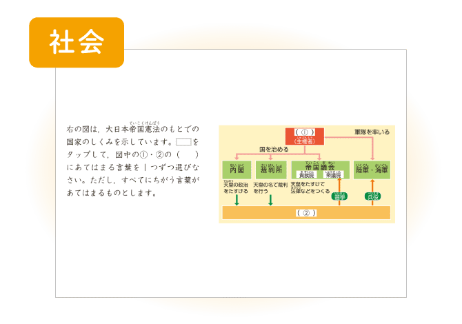 明治時代に入ると、日本では近代化のためのさまざまな改革が行われていきました。政治面での改革として、大日本帝国憲法の制定はとても重要です。練習問題では、大日本帝国憲法下での天皇と国民の関係を中心に、政治のしくみを図解しています。