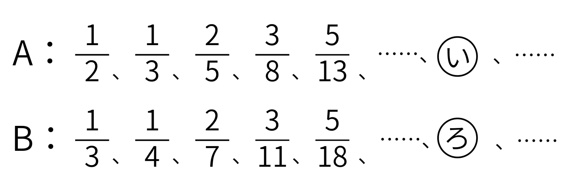 ・A、Bの分子の数は、どちらも1、1からはじまるので、3番目以降もずっと同じ数になる。