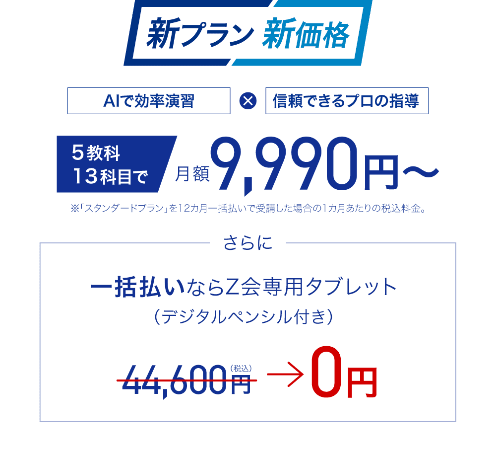 月額9,990円は、Z会専用タブレットを購入し、「スタンダートプラン」を12カ月一括払いで受講した場合の税込料金。
