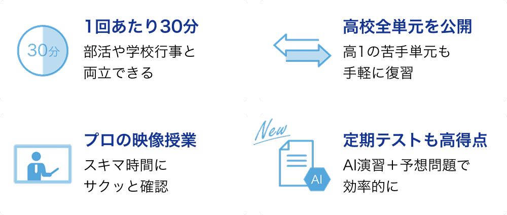 「単元別強化学習」は、高校3年間の単元を自由に学べるオープンカリキュラム。学校の進度に合わせて単元を選べるだけでなく、高1の範囲にさかのぼって取り組むことが可能。積み残した苦手単元も、基礎から復習できます。