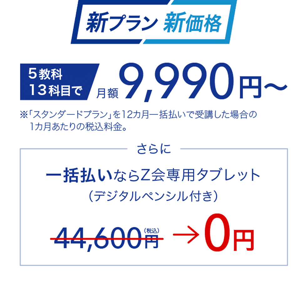 月額9,990円は、Z会専用タブレットを購入し、「スタンダートプラン」を12カ月一括払いで受講した場合の税込料金。