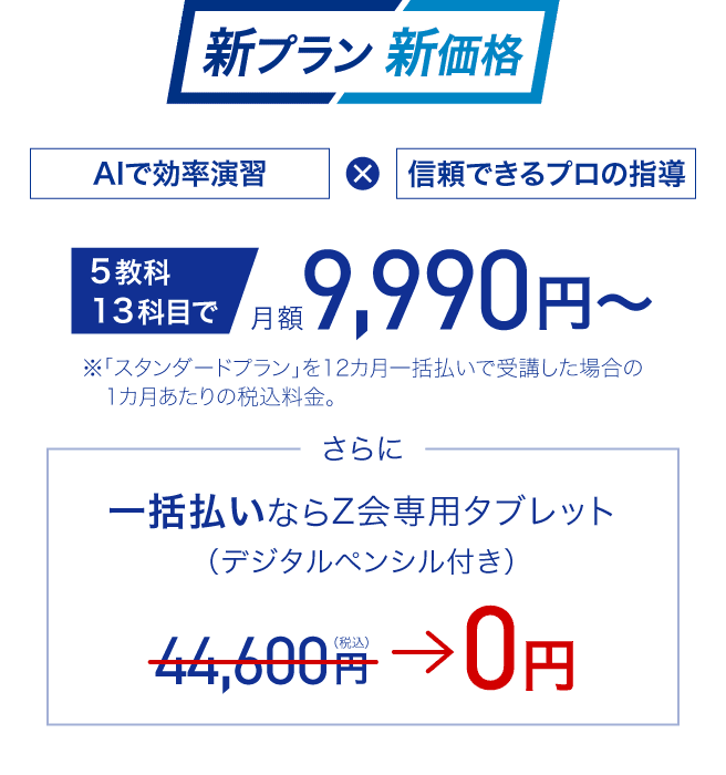 月額9,990円は、Z会専用タブレットを購入し、「スタンダートプラン」を12カ月一括払いで受講した場合の税込料金。