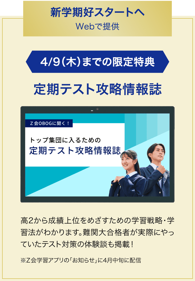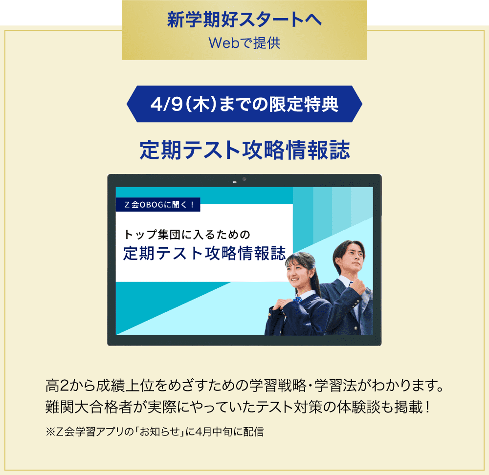 Z会は、“プロ”による添削学習。暗記だけに頼らないから、「わかったつもり」がゼロに。高2の伸び悩みを解消でき、定期テスト高得点・志望大合格へリードできます。