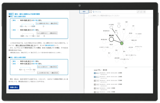 知りたい用語を検索すると、関連する知識まで単元をまたいで可視化。単なる1つの知識の確認に留まらず、「その知識が何にどうつながるのか」までわかるので、「深い理解」として定着します。