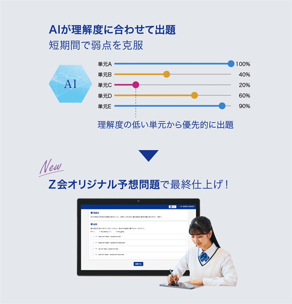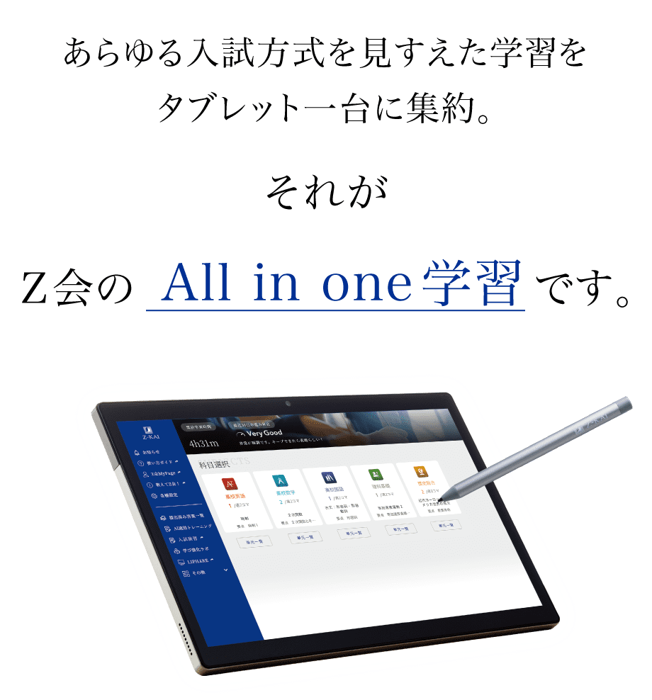 Z会の高校コースでは、一般選抜の対策はもちろん、推薦入試を見すえた対策までタブレット一台に集約しました。