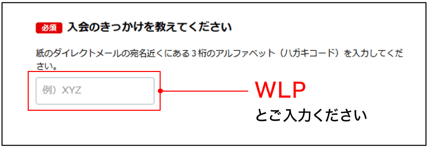 ・確認画面に表示される「入会のきっかけを教えてください」の欄にキャンペーンコード「WLP 」を必ずご入力ください。