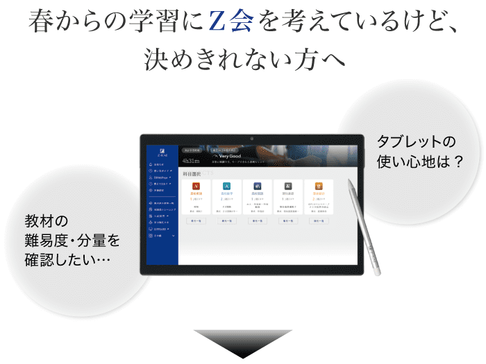 「Z会学習アプリ」は3/1からご利用いただけます。Z会専用タブレットをご購入の場合、お申し込み後1週間ほどでお届けいたします。