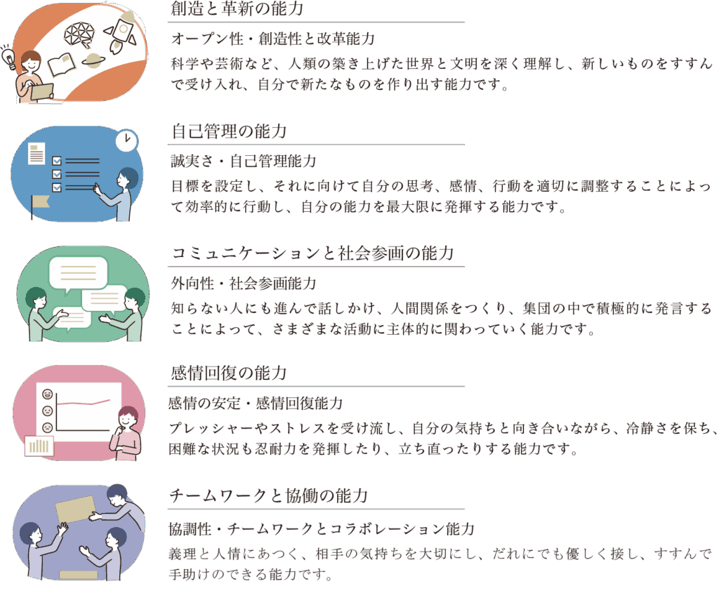 いま私たちを取り巻く環境は、ICT技術の進歩やAIの台頭、グローバル化、少子高齢化などにより目まぐるしく変化していますが、このような世の中で子どもたちに求められるのは、単なる知識の積み重ねではなく、人との関わりの中で知識を使いこなす力や、自ら課題を発見し新しい価値を生み出す力、つまり「非認知能力」です。