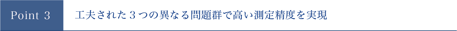 本アセスメントは工夫された3種類の質問形式により構成されています。自己申告問題以外も設定することで、バイアスを排除した、より科学的で信頼性の高い測定精度を実現しています。