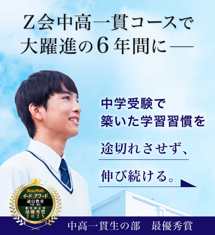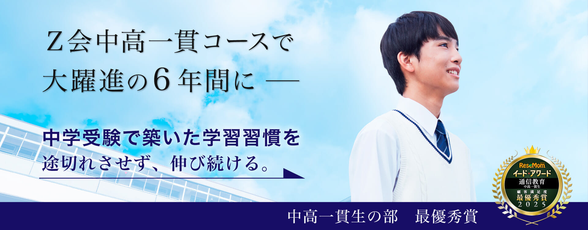 ※Z会中高一貫コースは、株式会社イード(https://www.iid.co.jp/)が主催するイード・アワード2025「通信教育」中高一貫生の部において総合満足度最優秀賞、ならびに「教材がよい通信教育」「添削の質が良い通信教育」「効果がある通信教育」「継続しやすい通信教育」「授業料の満足度が高い通信教育」「ブランドの信頼性が高い通信教育」「受験・進学情報充実の通信教育」各部門賞を受賞しました。