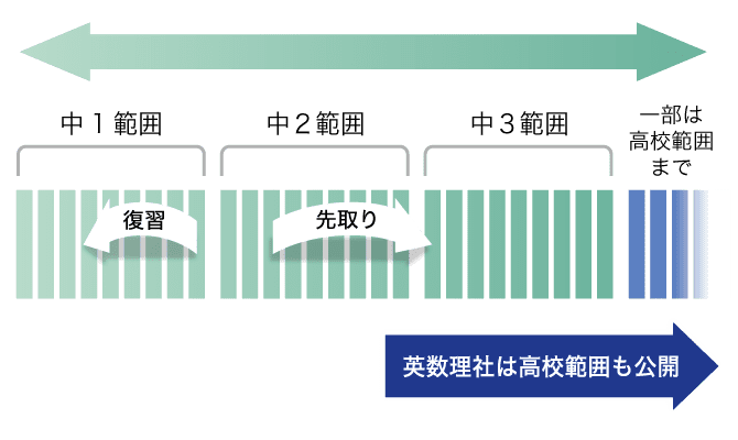 中学3年間分+高校範囲※の単元に自由に取り組めるので、中高一貫コースは、千差万別な一貫校の進度・レベルにぴったり合わせた学習ができます。