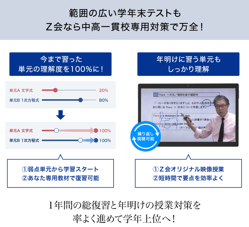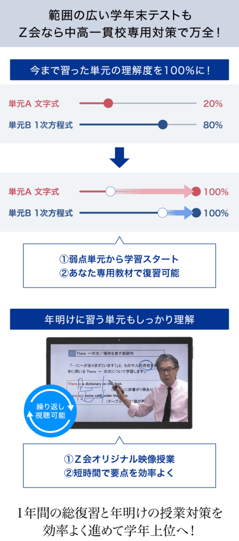 中学3年分の全単元に加え、高校範囲の一部を公開。Z会なら「オープンカリキュラム」で、学校独自の進度に合わせて学習できるので安心。