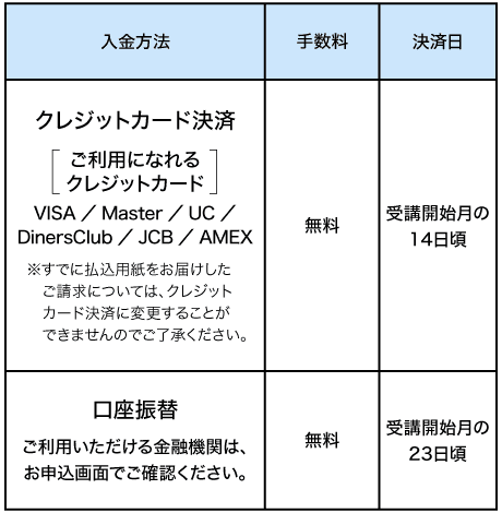 受講開始月から12カ月または6カ月分の受講会費を一括してご請求します。