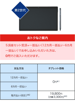 ※1「3教科セットもしくは5教科セット」かつ「12カ月一括払いまたは6カ月一括払い」の受講内容で「Z会専用タブレット」をお申し込みいただくと、44,600円の値引きの適用により、「Z会専用タブレット」を0円でご購入いただけます。