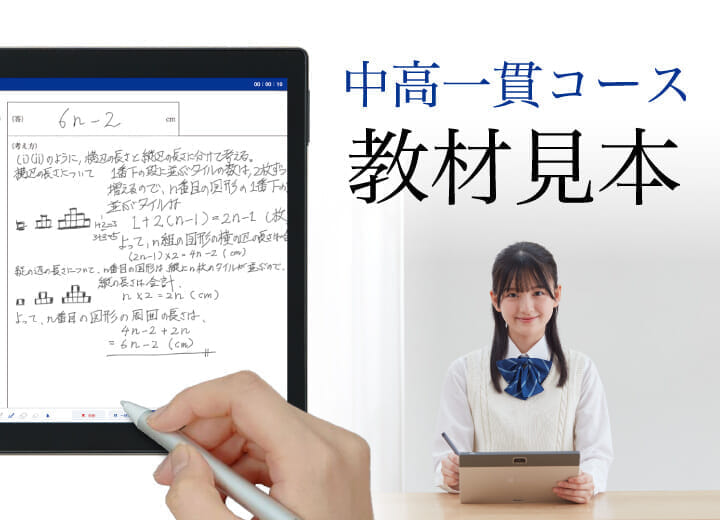添削問題・添削指導は5教科全てに対応、タブレット上にデジタルペンシルで書き込み提出する形式です。各単元のまとめとして、学んだ知識を使って解答を導くための「考え方」を広げ、入試で必要な「思考力・表現力」へ実力を引き上げる問題に取り組みます。