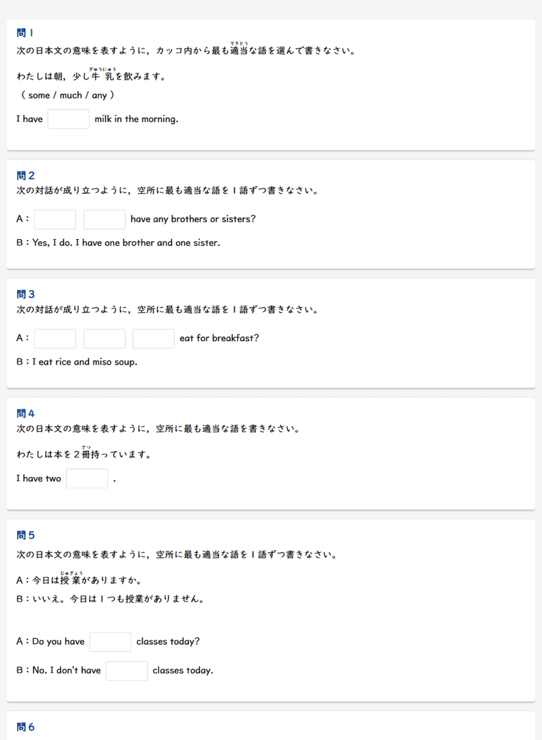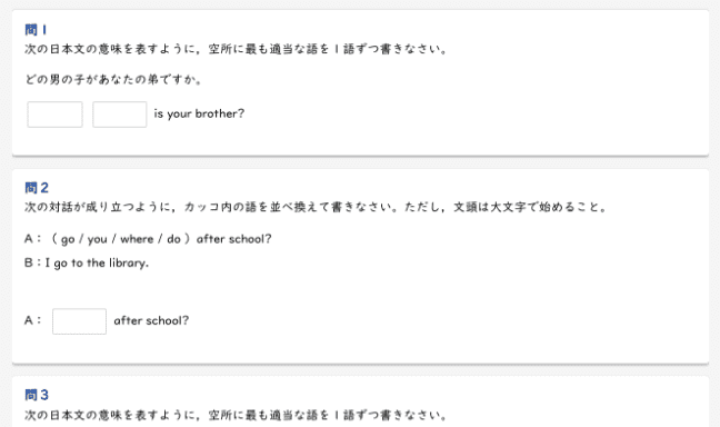 さまざまな形式の演習問題で、疑問詞を使った英文のルールが定着しているかを確認します。