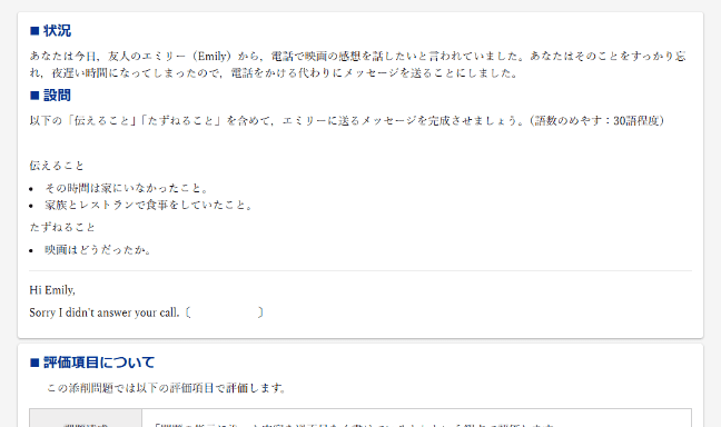 友人宛のメッセージという場面設定で、be動詞の過去形を使った英文作成を行います。