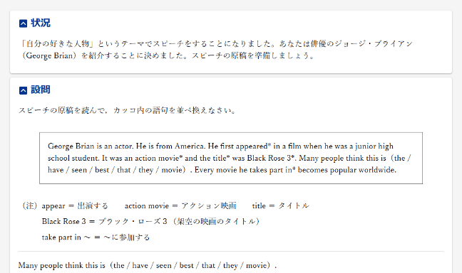 報告書を書くという場面設定で、受動態を使った英文作成を行います。